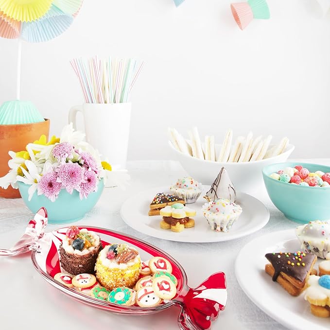 - š¬ć Unique Design ć-- This decorative platter is designed to mimic the look of a candy for a stylish touch. And the candy tray features red and transparent stripes, crystal clear. Exquisite workmanship perfectly fits well with candy shape to increase sense of beauty for your life.