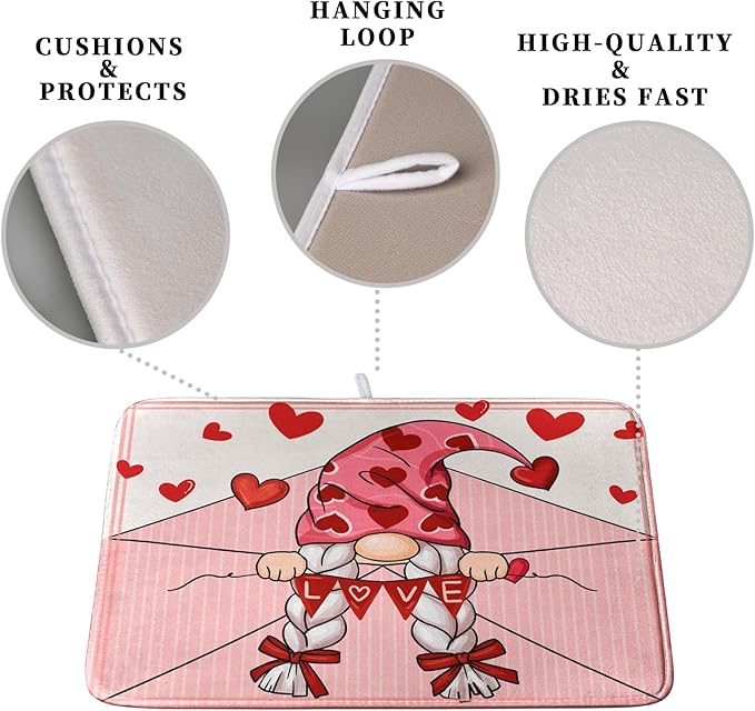 - 【Perfect Dimension】The Valentine's Day Love Letter dish mat size 18x24 inch, fits most counters. The Love Letter Gnome drying mat is soft pliable material easily rolls or folds up for storage, simply fold up and toss in a drawer or tuck it elsewhere, does not take up space.