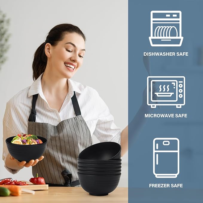 Cereal Bowls - Wheat Straw Bowl Set of 6, 26 OZ Unbreakable Bowls for Kitchen, Alternative to Plastic Bowls Reusable, Microwave Safe Bowl for Soup, Salad, Oatmeal, Snack (Black)