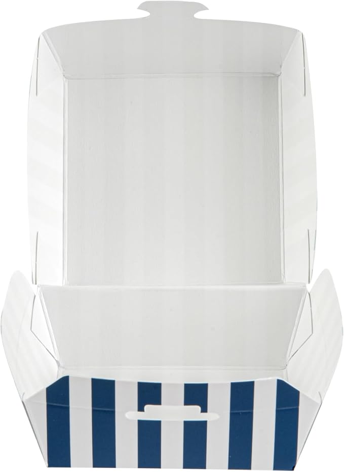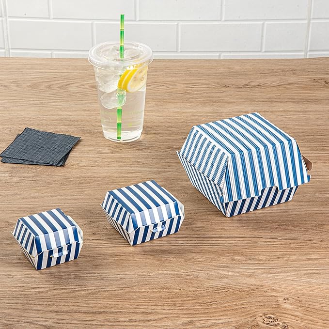 - VERSATILE DESIGN: The blue and white stripes of these take out boxes complements the theme and decor of cafes and restaurants. Serve your burgers in these stylish boxes!