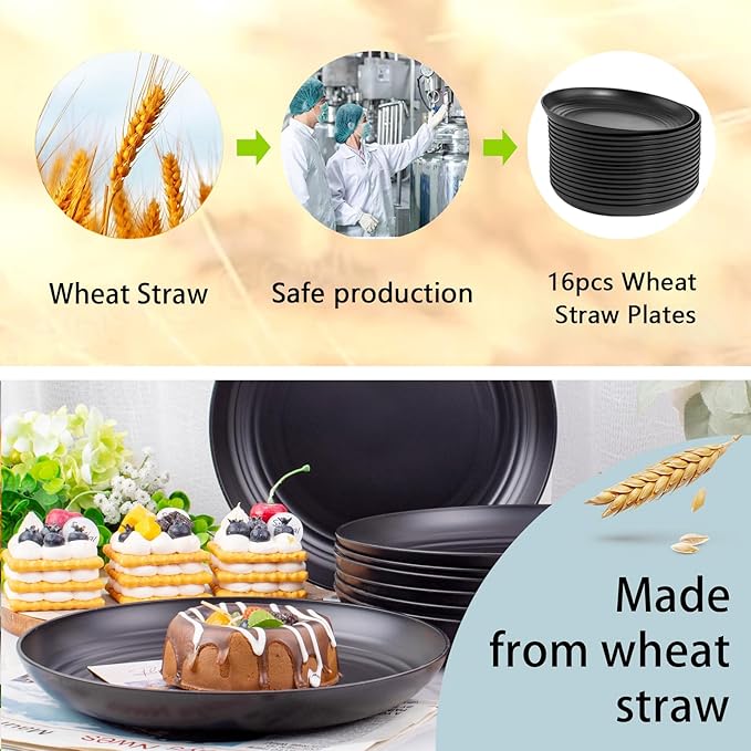 supernal 16pcs Black Wheat Straw Plates,10 inch Unbreakable Dinner Plates,Reusable Plastic Plates,Dishwasher & Microwave Safe,Lightweight Dinnerware Plat Set for Kitchen,Camping