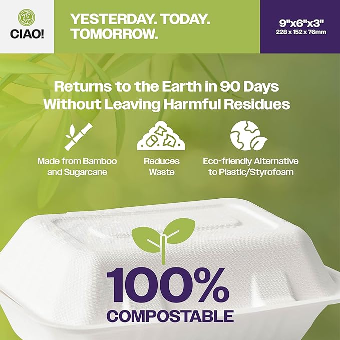 CIAO! 9"X6"X3" Clamshell 1 Compartment 100% Compostable Ecofriendly PFAS Free Unbleached Bagasse Natural White (250/case)