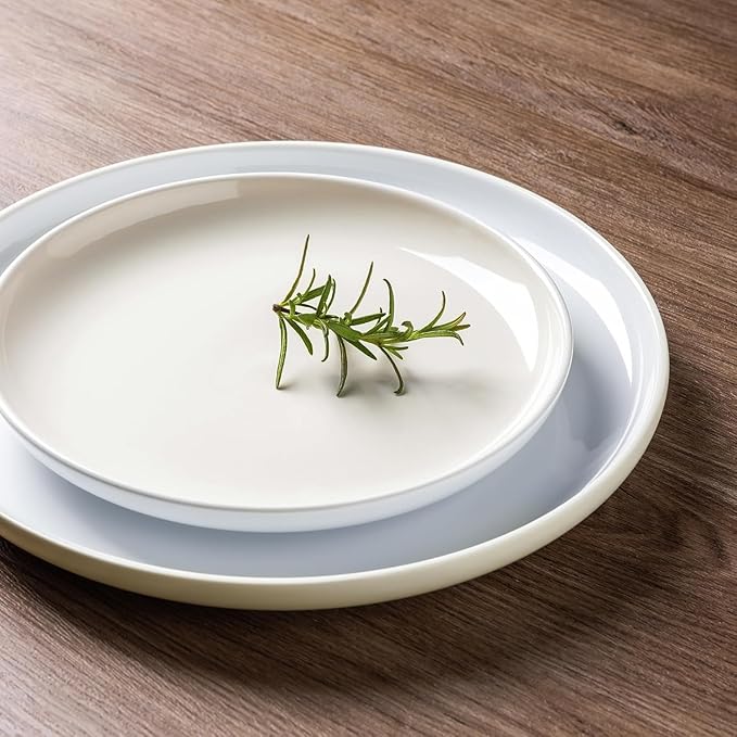 - 【UNIQUE MODERN DESIGN】Designed by the artist, our round glossy ceramic dinnerware set features a modern and elegant double-color design, the big plate and bowl inner glaze is pure snow-white, and the exterior and rims are colored, the color scheme of the small plate is opposite, which looks ultra classy and beautiful. The pure white color of the dinner plate adds a touch of purity and cleanliness, ensuring that your culinary creations take center stage