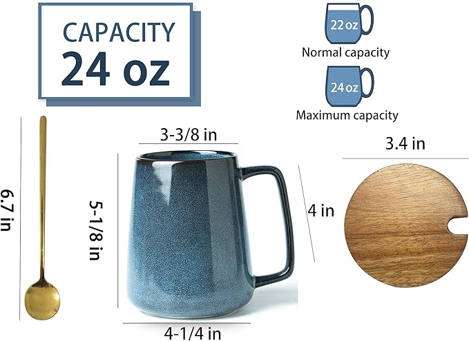 24 OZ Extra Large Ceramic Coffee Mug, with Spoon and Wooden Lid, Big Tea Cups with a Large Handle for Office and Home, Microwave and Dishwasher Safe (24 oz Blue Set)