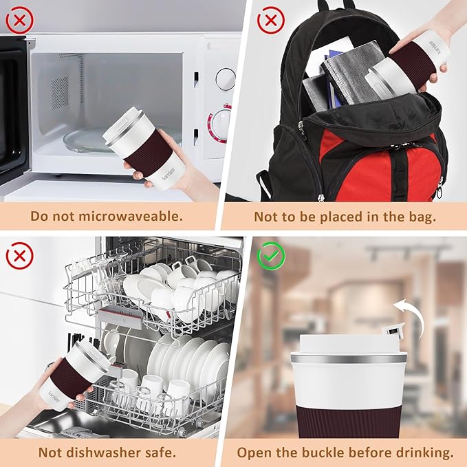 - 【 Dishwasher Not Recommended】 No seam on the inner wall of the coffee tumbler and 3.35 inches wide mouth of the travel mug make your wash job a breeze. only need to rotate and unscrew the cap, place the coffee travel mug under the running water to rinse.