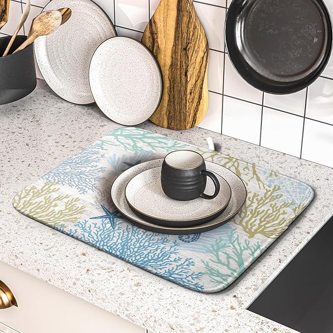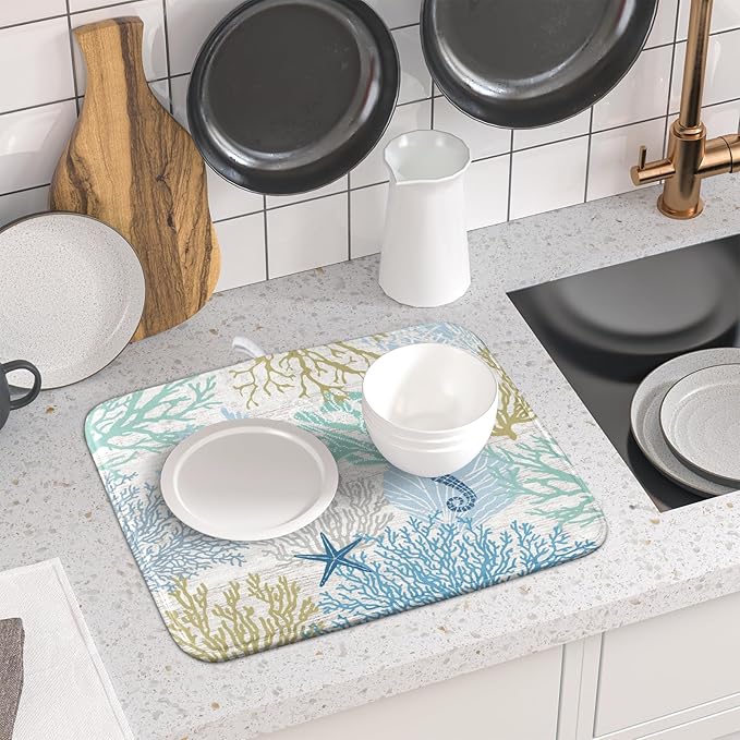 Blue Coral Dish Drying Mat Coastal Starfish Dishes Pad Hanging Drainer Mats Reversible Absorbent Kitchen Counter Protector 16x18 Inch