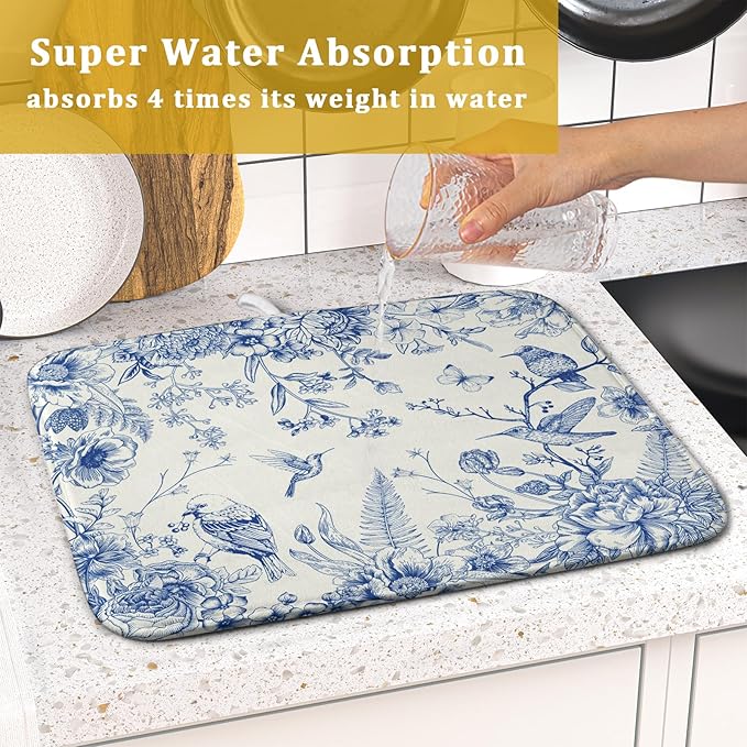 Chinoiserie Dish Drying Mat 16x18 Inches, Blue White Birds Floral Flowers Super Absorbent Microfiber Dish Rack Pad Mat for Kitchen Counter Coffee Bar