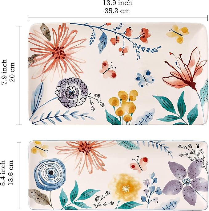Bico Blossom Symphony Ceramic 14 inch Rectangular Serving Platter, Set of 2, for Serving Salad, Pasta, Cheese, Ham, Appetizer, Microwave & Dishwasher Safe