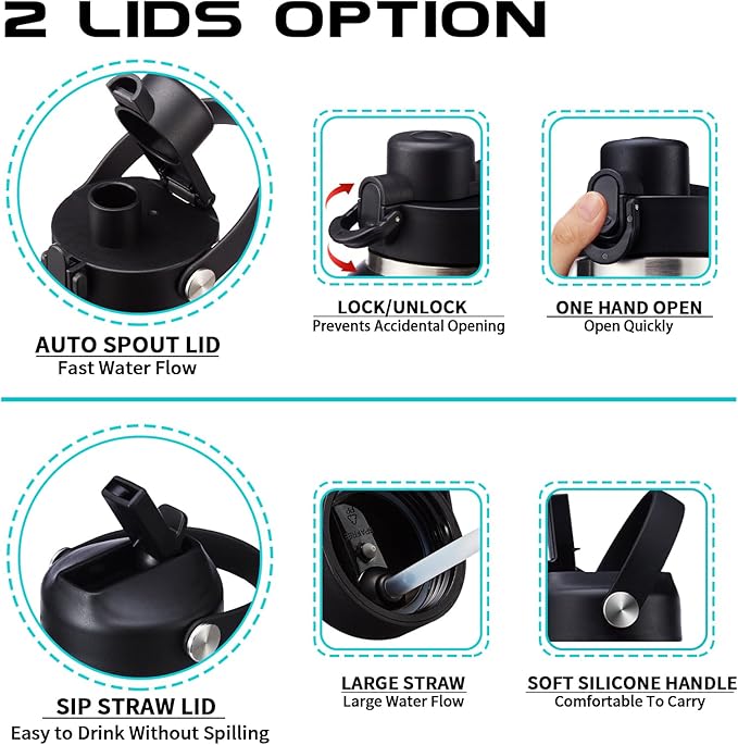 - √ LEAKPROOF STRAW & CHUG LIDS (Real Sealed): Every water bottle come with 1pcs splash-resistant Press-In straw lid, and 1pcs POP-UP spout chug lid which with a button lock. Both BPA-free, leak-proof and one-hand control design.