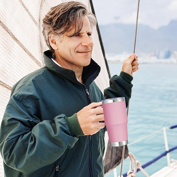 - High Quality And Easy To Hold: The 20 oz travel coffee mug is made of thickened 304 18/8 stainless steel. Electro polished inside make you every sip of water pure and sweet. Matte powder coating outside is sweatproof. Equipped with a sturdy 360°welded handle let you easy to hold the coffee travel tumbler