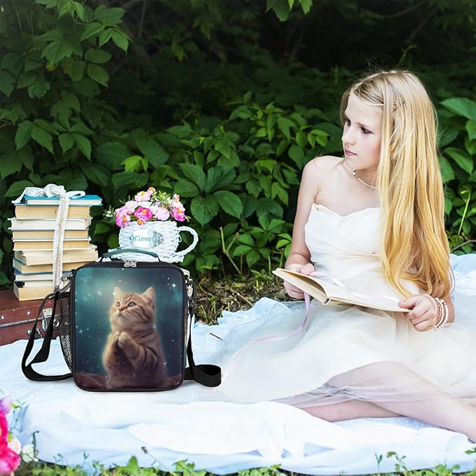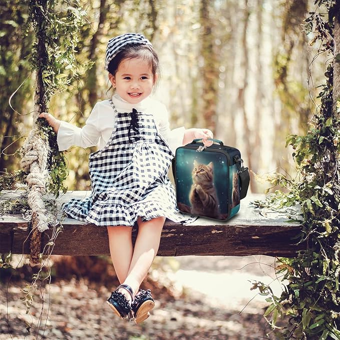 Cat Lunch Box for Kids, Cute Kitten Space Universe Lunch Bag for Boys Girls, Reusable Insulated Waterproof Lunch Box with Adjustable Shoulder Strap Thermal Cooler Tote Bag for School Daycare Picnic