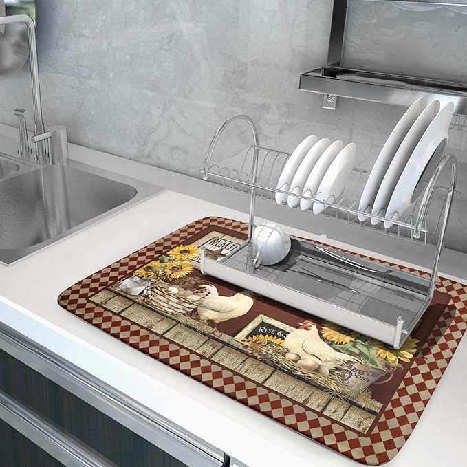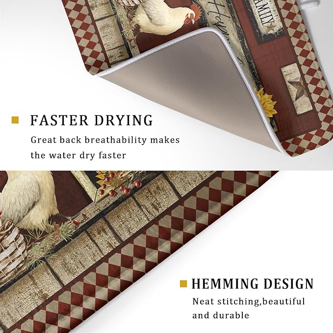 Vintage Rooster Dish Drying Mat 18x24 Inch Farmhouse Chicken Dish Drainer Pad Microfiber Absorbent Fast Dry Kitchen Counter Accessories
