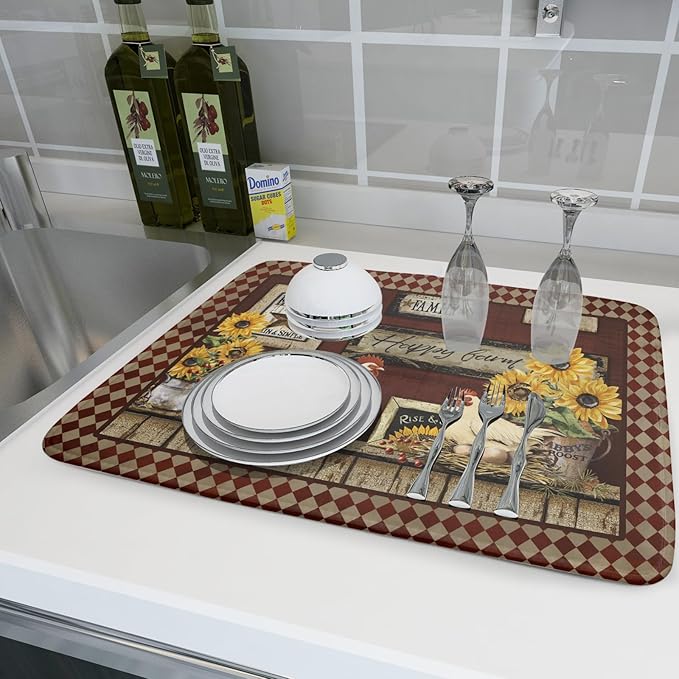 - 【Wide Usage】The dish drying mat designed with sunflower flowers pattern, it is beautiful, soft, and durable. Not only a dish drying mat, cup mat, heat resistant mat, you can also use it as a kitchen countertop insulation mat. It is also a good choice to use it as a pet mat, picnic mat.