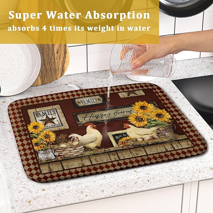 Vintage Rooster Dish Drying Mat 16x18 Inch Farmhouse Chicken Dish Drainer Pad Microfiber Absorbent Fast Dry Kitchen Counter Accessories