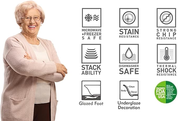 - CHIP-RESISTANT AND DURABLE: Fine porcelain, high-quality durable under-glaze decoration, smooth glazed foot to minimize table scratching, stackable. All sets passed USA’s FDA standards and are BPA-free.