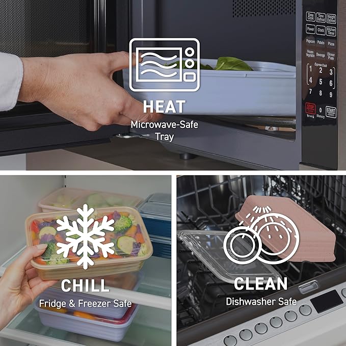 - Easy to Heat & Clean: Safely heat up your food straight from the freezer or refrigerator for warm, delicious meals and leftovers. Each meal prep container is both microwave and top-shelf dishwasher safe. Note: do not microwave lids, only the trays are microwavable. For best results, hand wash to extend the life of the product.