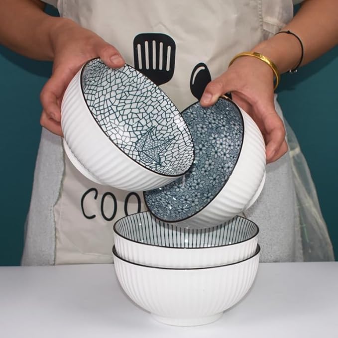 - Japanese Style: The bowls have a classic white exterior with vertical ridges adding texture. One of the bowls features an interior with a striking blue and white pattern, which gives it a unique and artistic appearance.