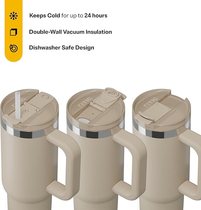 RTIC 30 oz Road Trip Tumbler Double-Walled Ceramic Lined InsulatedStainless Steel Portable Travel Coffee Mug Cup with Lid, Handle and Straw, Beach