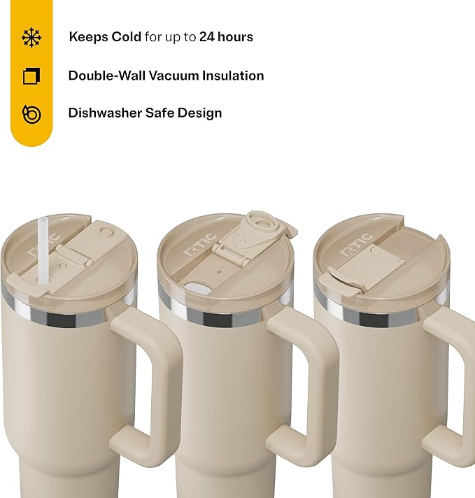 RTIC 40 oz Road Trip Tumbler Double-Walled Cermaic Lined Insulated Stainless Steel Portable Travel Coffee Mug Cup with Lid, Handle and Straw, Beach