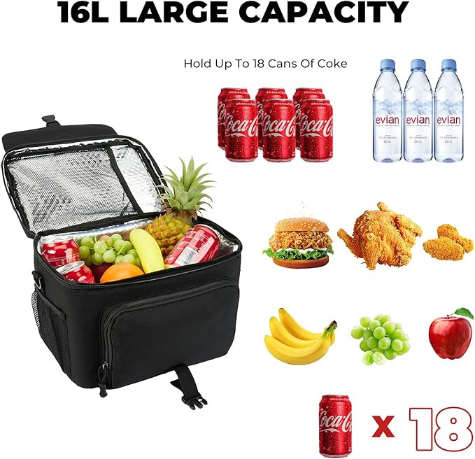 - 16L Large Capacity: The Lunch Box size is 13.0" x 8.3" x 9.85" (L x W x H).The main compartment capacity is 16L to store your fresh lunch or cold drinks. Designed with front and back zipper pockets, a side mesh pocket, a side pocket with molle, and an inner mesh pocket, can be used to store bottles, tableware, napkins, can openers, wallets, keys, and other essentials. Convenience for daily use