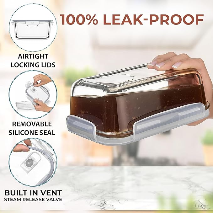 - 【Airtight & Leakproof】 Snap locking lids with silicone seals ensure airtight and leakproof protection, keeping your food fresh. These glass food storage containers are ideal for meal prep glass containers with lids, freezer storage containers, and storing leftovers without spills.