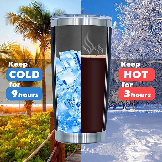 - 【 DOUBLE-WALL VACUUM TUMBLERS 】- Our 20oz tumbler mugs are made of Food Grade 304 18/8 Stainless Steel. The tumblers are with Double-Walled vacuum insulation design, which can keep your on-the-go beverages hot for 3+ hours and cold for 9+ hours. And our tumblers can fit most of the car cup holders. Enjoy your drink for a long time!