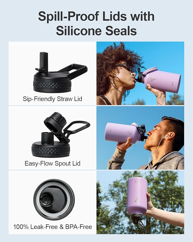 - No Leaks, No Worries: This stainless steel water bottle ncludes two leak-proof lids—a straw lid and a spout lid. Both are equipped with silicone rings to prevent any spills or leaks, and are completely BPA-free for your peace of mind.