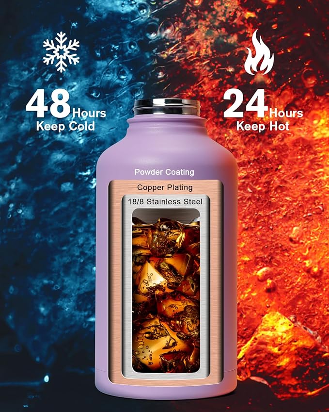- Cold for 48H & Hot for 24H:Topre 64 oz Half Gallon Insulated Water Bottle features advanced triple-wall vacuum insulation with copper plating, the water flask preserve the freshness and temperature of your drinks throughout the day.