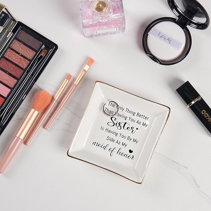 - Bridesmaid Gifts: “The only thing better than having you as my sister is having you by my side as my maid of honor." With heartwarming words, the jewelry dish makes the bridesmaid feel love and happy. Ideal for Maid of Honor Proposal Gifts, Matron of Honor Proposal Gifts, Bridesmaids Proposal Gifts, Maid of Honor Gift from the bride, Bridesmaids Gift for wedding, Bridesmaid Thank You Gifts, gifts for bridesmaids on the wedding day, bachelorette gifts for bridesmaids