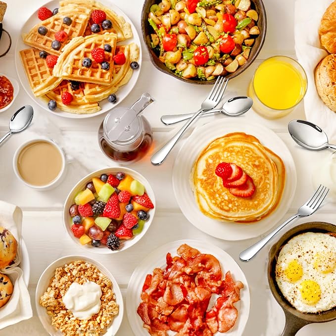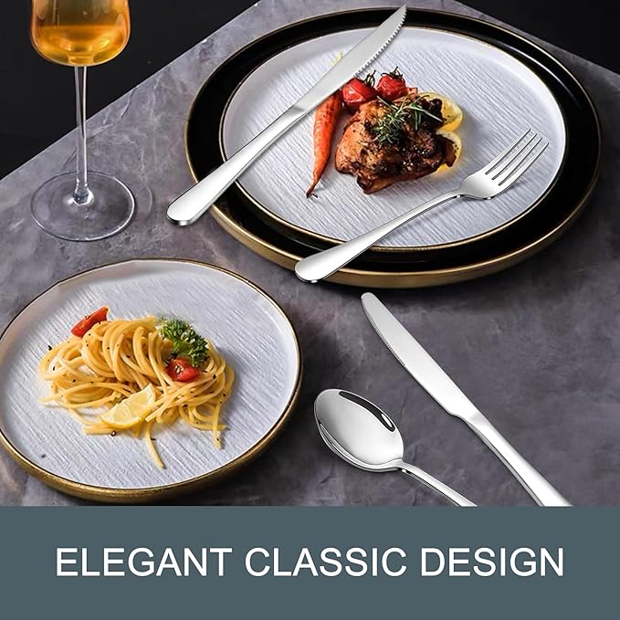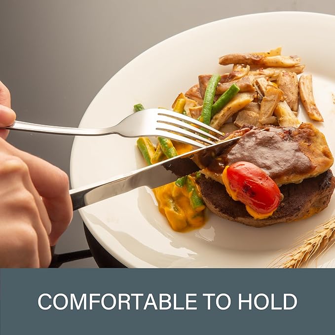 - COMFORTABLE DESIGN: This flatware set has a classic silhouette with clean lines and polish-finish surface , a good choice to go with your existing tableware. The smooth edge of the handle is pleasure to hold, appropriate weight and perfect balance are added to ensure maximum comfort during use.
