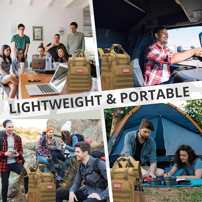 - Strategically Designed for Efficiency:ATRIPACK tactical backpack cooler is equipped with essential features including a flag patch, carabiner, and removable bottle opener. The MOLLE webbing on the front enables attachment of pouches or small items, while seven functional pockets ensure efficient organization of drinks, snacks, utensils, food, and personal items, keeping them separate and easily accessible.
