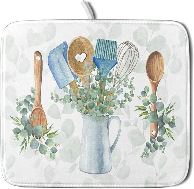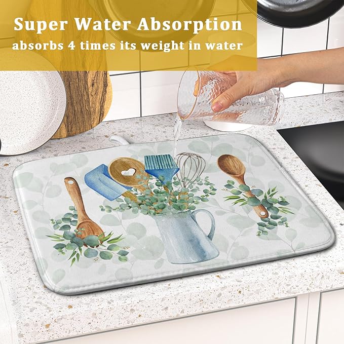 - 【Wide Usage】The dish drying mat designed with kitchen tool pattern, it is beautiful, soft, and durable. Not only a dish drying mat, cup mat, heat resistant mat, you can also use it as a kitchen countertop insulation mat. It is also a good choice to use it as a pet mat, picnic mat.