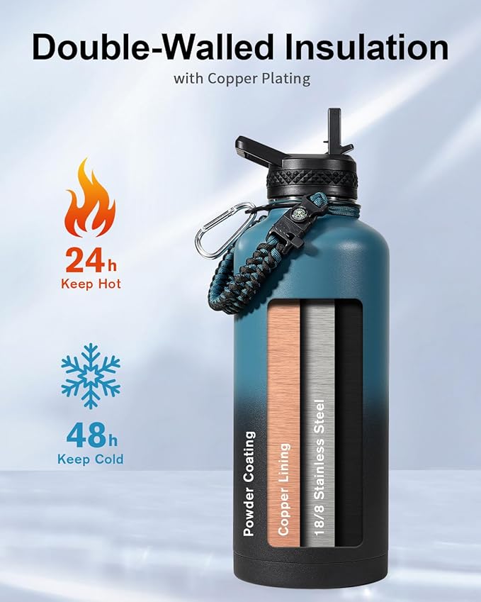 - Double Wall Insulation Water Bottle: Vacuum insulated double wall stainless steel bottle with copper plating maxes its keep-cold to 48 hrs and keep-warm to 24 hrs, allowing you to enjoy your favorite flavor in the long run.