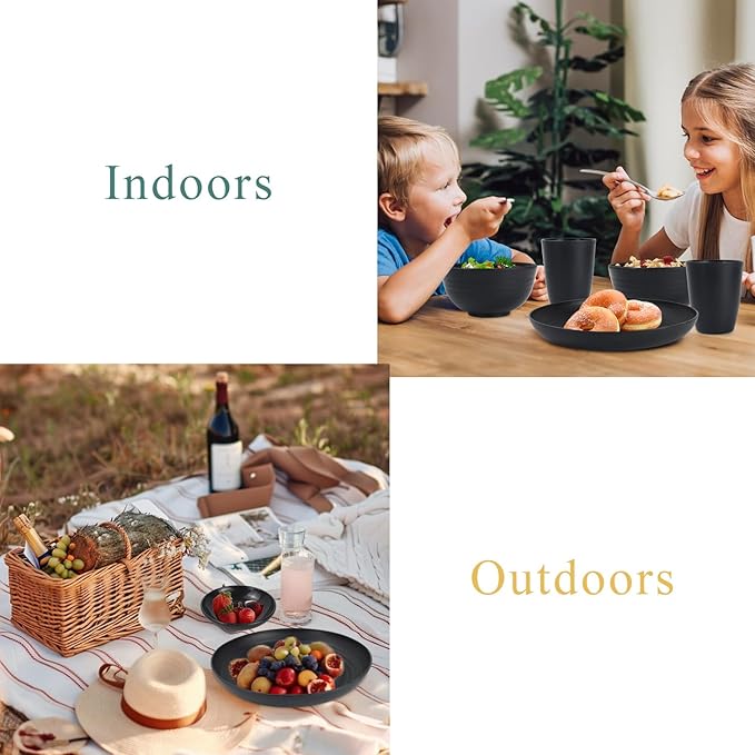 Wrova Wheat straw dinnerware sets of 16-10 inches plates,26oz bowls,2oz dipping bowls,12ozcups - Unbreakable plates and bowls sets microwave safe and dishwasher safe,service for 4. Black