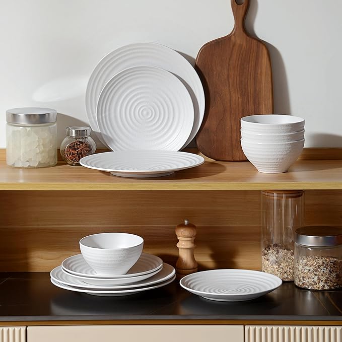 White Melamine Dinnerware Sets,12PCs Anti-scratch Dishes Set, Lightweight and Non breakable Dinnerware,Suit for Indoor and Outdoor Use, Dishwasher Safe,BPA free (Classic White)