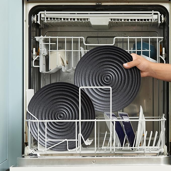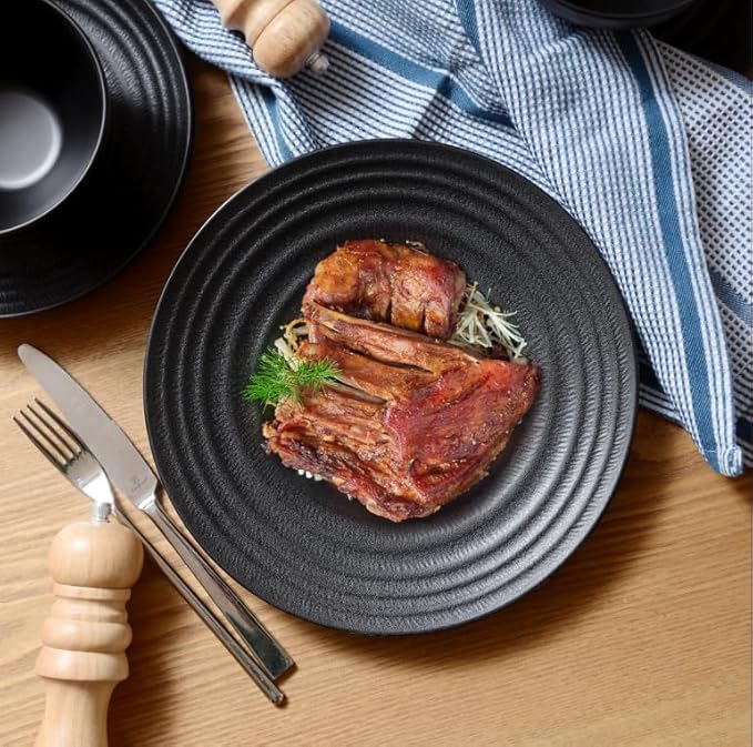 - 【Modern Romantic dinner table set for 4】 : This black melamine Plates features unique spiral textures. With a minimalist design that pairs with timeless style, it’s a great choice for family meals, casual gatherings, and outdoor activities.