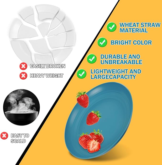 - Safe Materials: The wheat straw camping plates set is made of natural straw fibers and food grade safe materials. It is 100% free of bisphenol A and non-toxic. Durable and sturdy, the autumn four-color (deep blue, blue, turquoise, green) plastic dinnerware set is very sturdy, durable, lightweight, and unbreakable. It will not break or shatter like porcelain or ceramics, even if accidentally dropped or impacted!