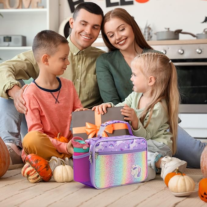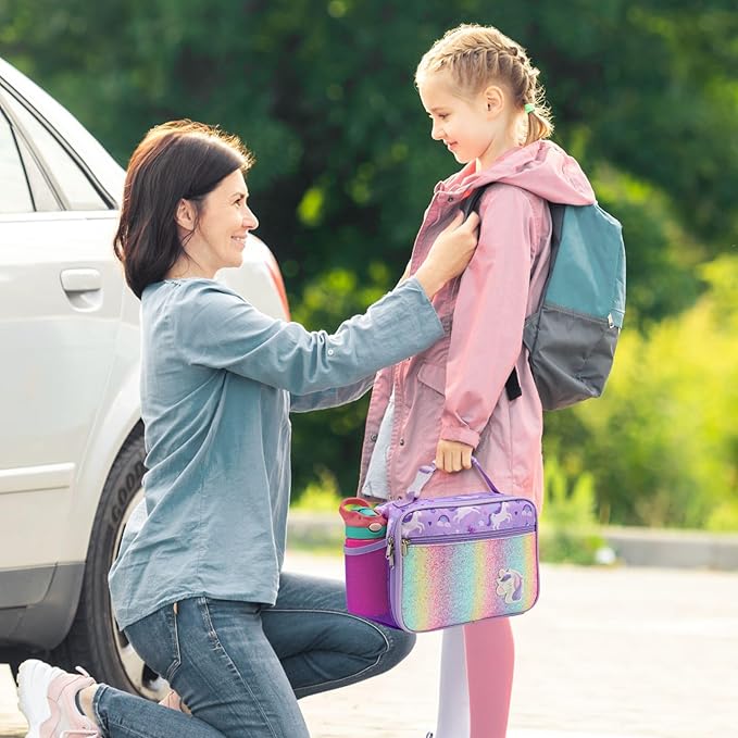 Bagseri Lunch Bag for Girls - Kids Lunch Box for Girls Reusable Leak-Proof and Insulated Kids Lunch Bag Toddler Lunch Box for Daycare and School, Glitter Purple Unicorn (Water Bottle Not Included)