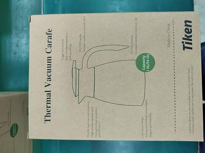 - This coffee carafe has a capacity of 34 Oz(1.0L). Tiken vacuum insulation technology locks in temperature to preserve flavour and freshness, that keeps the temperature above 173.7°F at 12 hrs (assuming a starting temperature of 203°F, a room temperature of 68 °F and water left untouched throughout the duration of the test). Pls note test results will vary depending on beverage starting temperature and how full the carafe is.