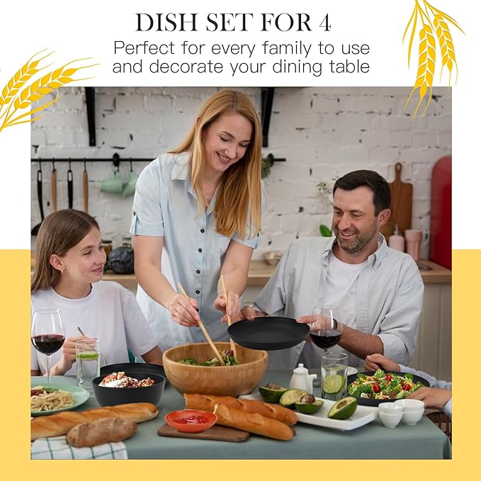 Wheat Straw Dishes Set 16 PCS, Service for 4,Unbreakable and Ruseable Plastic Dinnerware Sets,Dishwasher & Microwave Safe Plates Set for Kitchen,Camping,Dorm,Dessert Plates, Drinking Glasses(Black)