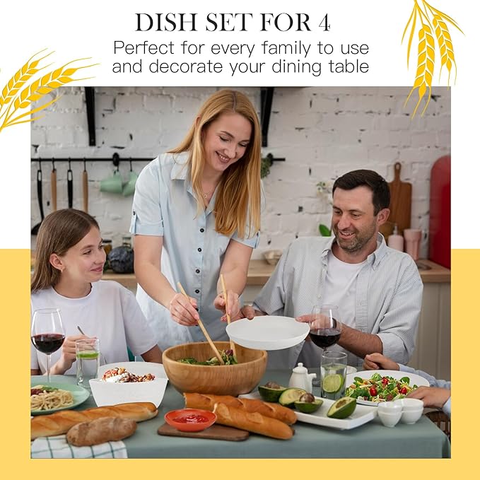 - 【16-PIECE DINNERWARE SET】Our wheat straw dinnerware set Includes 4 x 10 inch plate, 4 x 26 oz bowls,4 x 12 oz cups and 4 x 4 inch sauce dish.Whether it is daily family gatherings, exquisite restaurants, or outdoor camping.It can give you the ultimate convenience and effortless elegance.