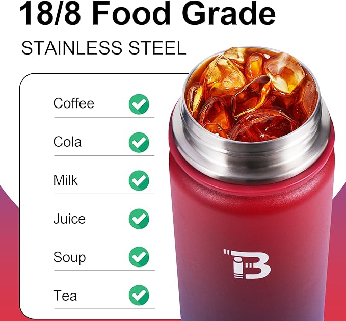 - DOUBLE WALL INSULATION: Our water bottle is made from high-quality 18/8 food-grade stainless steel, rust-proof, BPA-free, lead-free, and easy to wash. This wide mouth water bottle features double-walled vacuum insulation, which can keep your beverages cold for 24 hours and hot for 12 hours with a fresh taste. The wide mouth design is perfect for ice cubes and easy to clean.