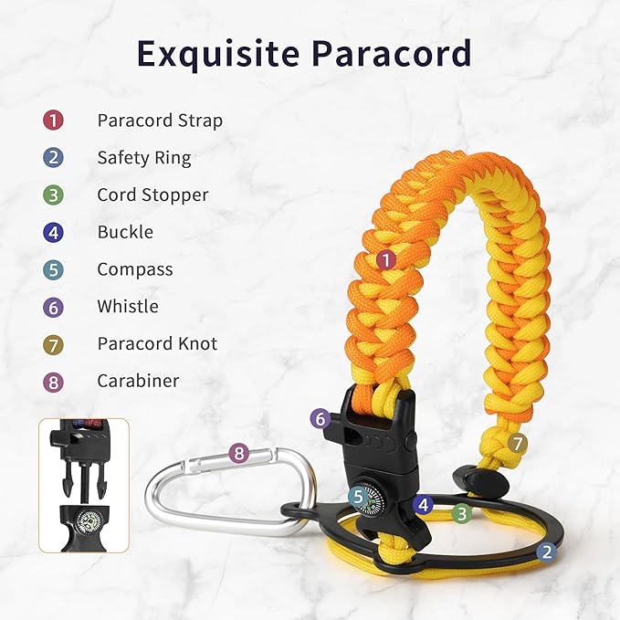- Full-function Paracord Handle: Brilliant paracord of matching colors bring out the bottle with a touch of youthful vibe. Compact compass and handy carabiner make the bottle the ideal survival kit for expeditions in the wild