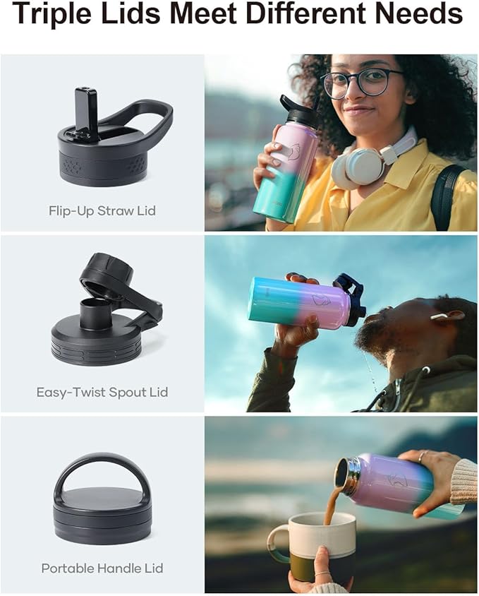 - Super Deal Combo: Buy 32oz insulated water bottle, get 7 accessories. The pack includes 1 x carrying pouch, 3 x lids, 2 x straws, and 1 x straw cleaner. This bottle is ideal for camping, hiking, cycling, running, gym sessions, or outdoor work, ensuring you stay hydrated wherever you go.