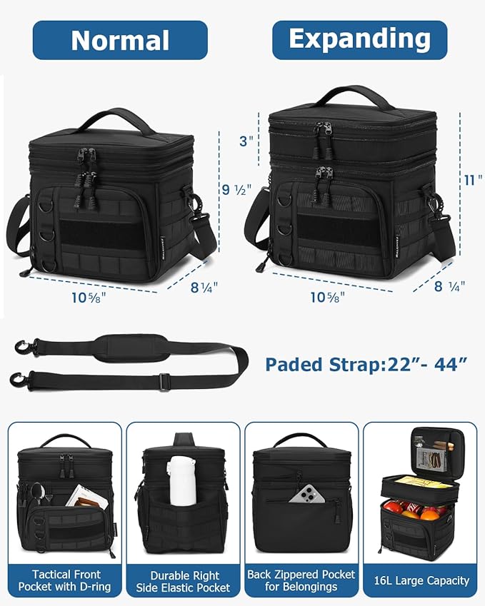 RalChyez Tactical Lunch Box for Men, Large Insulated Lunch Bag Expandable Double Deck Cooler Leakproof Waterproof Lunch Pail for Adult Women Work Office Shifts Picnic Travel Black