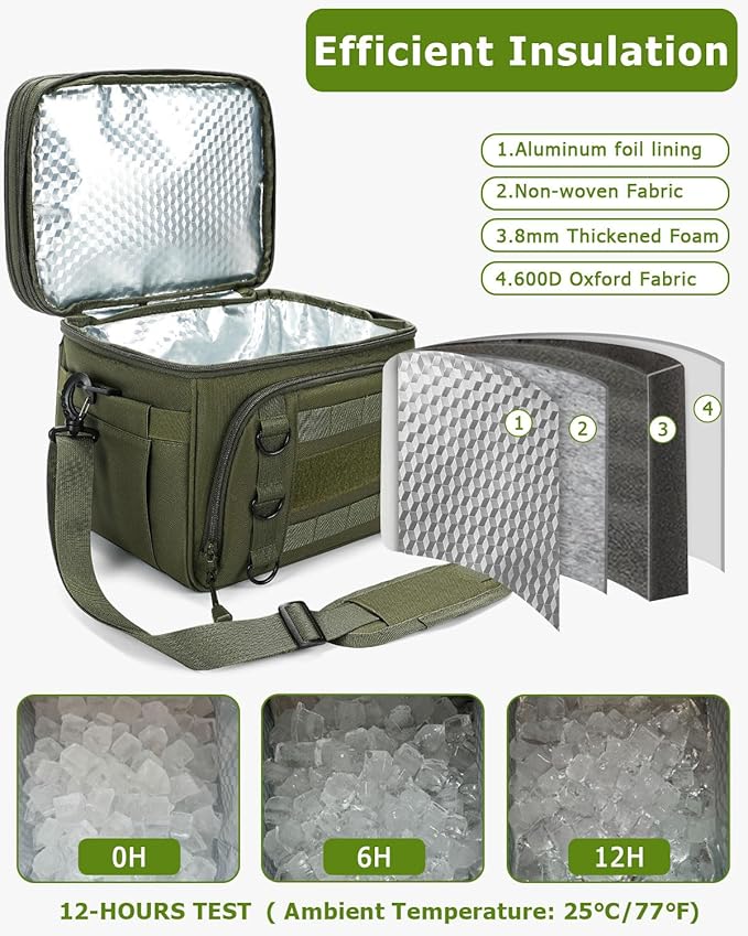 - 【Excellent Insulation】Tactical lunch bag features 4 layers of insulation material helps to keep food warm or cold for 12 hours. 8mm extra thickened foam with non-woven fabric under the heavy duty Oxford fabric and non-toxic aluminium foil liner, ensuring its insulation effect better than others, keeping drinks chilling and foods fresh, preventing nutrient loss.
