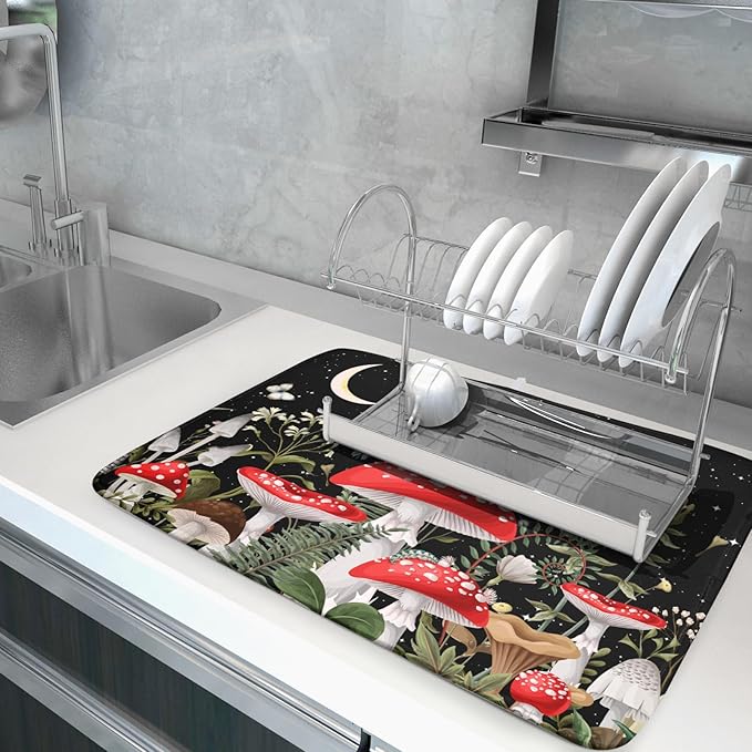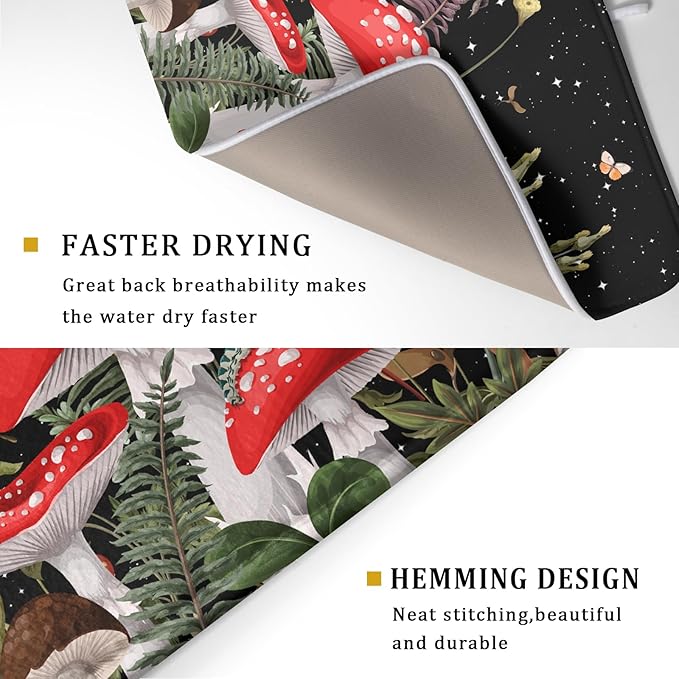 Red Mushroom Dish Drying Mat for Kitchen Counter Plant Leaves Drainer Mats Rack Holder Countertop Absorbent Microfiber Coffee Pads 18x24 Inch