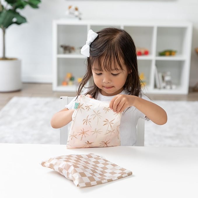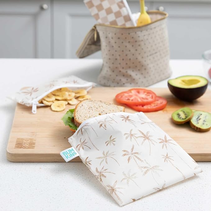 Bumkins Reusable Sandwich and Snack Bags, for Kids School Lunch and for Adults Portion, Washable Fabric, Waterproof Cloth Zip Bag, Travel Pouch, Food-Safe, Large 2-pk Palm Trees, Check