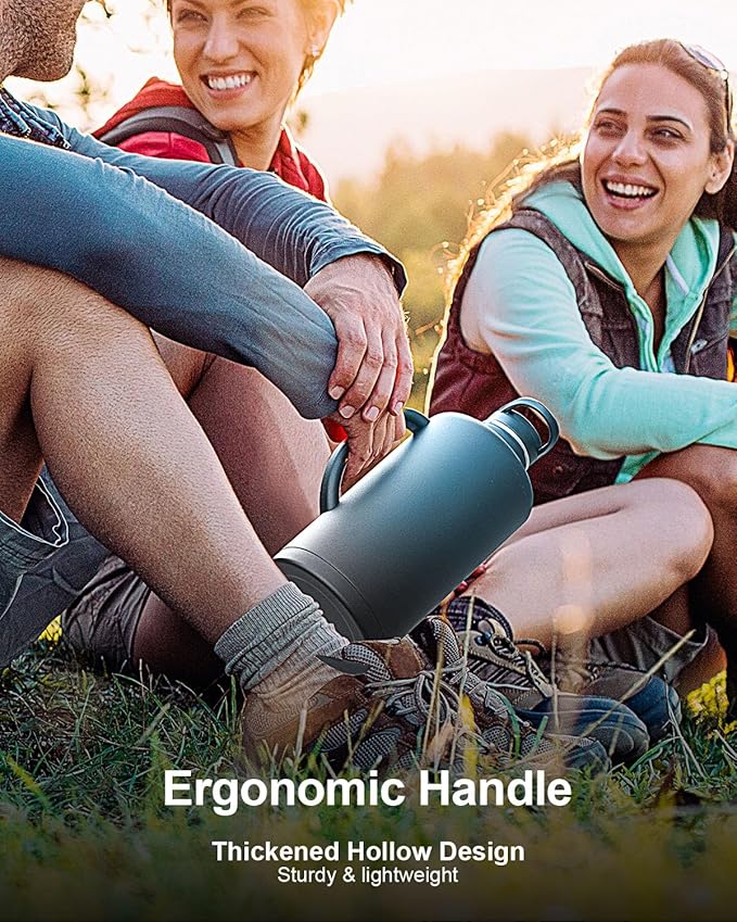 - A Handle You Can Rely On: Engineered with an integrated and ergonomic handle, Trebo 64 oz insulated water bottle is super sturdy and durable. The handle is thickened and hollowed for comfortable grip and easy lifting, so you can take it wherever you go. No Spills, No Worries: Our stainless steel water bottle comes with a dust-proof flip straw lid and a spill-free spout lid, meeting your different needs. With accurate silicone seal rings, they are both 100% leak-proof and spill-proof.