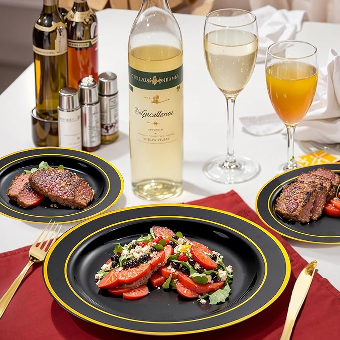 - CONVENIENT: Our black gold plastic disposable dinnerware set are sufficient and sturdy, you can use them with confidence